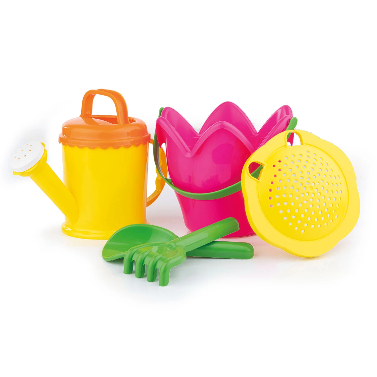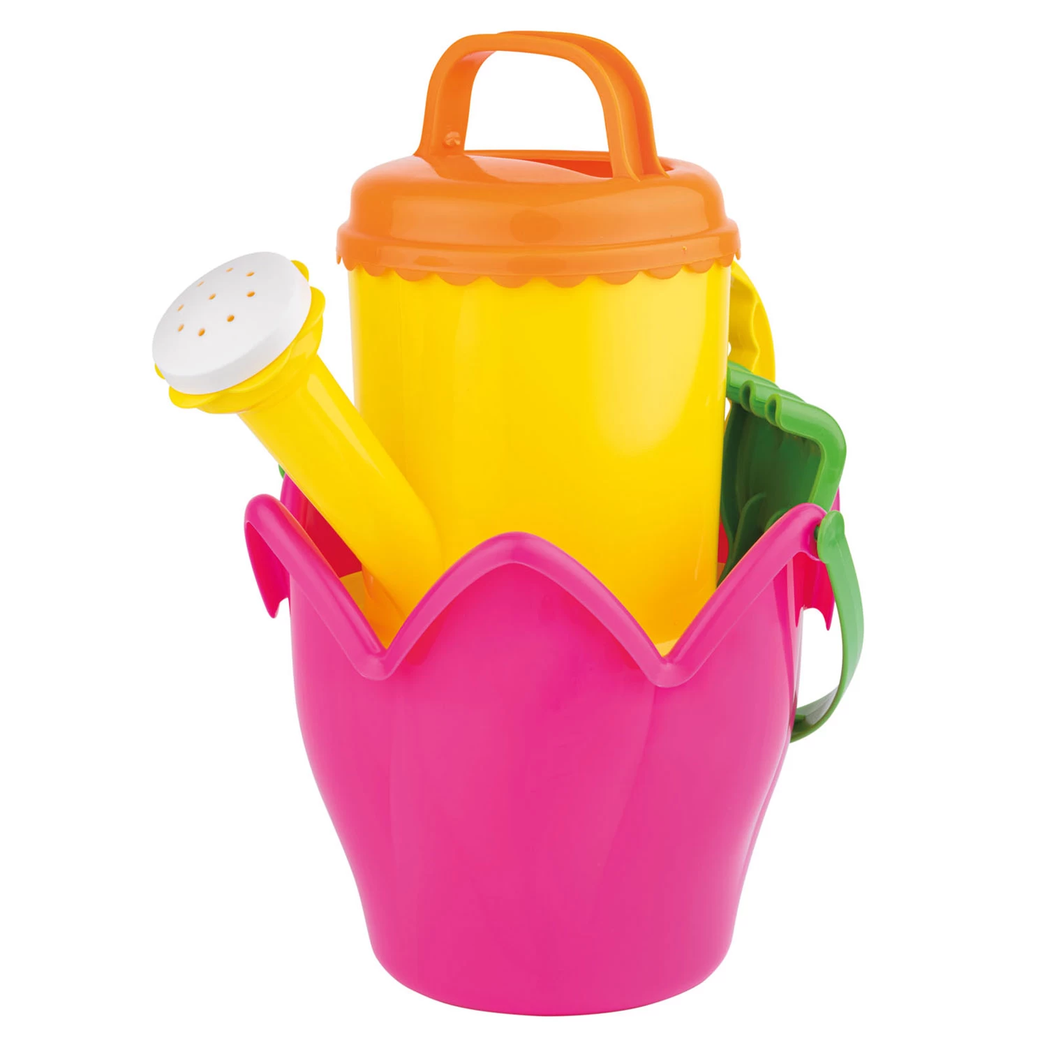 Deze 5-delige strandset is voorzien van vrolijke kleurtjes. Naast de 16 centimeter hoge emmer en gieter bevat de set een schep, een zeef en een hark.