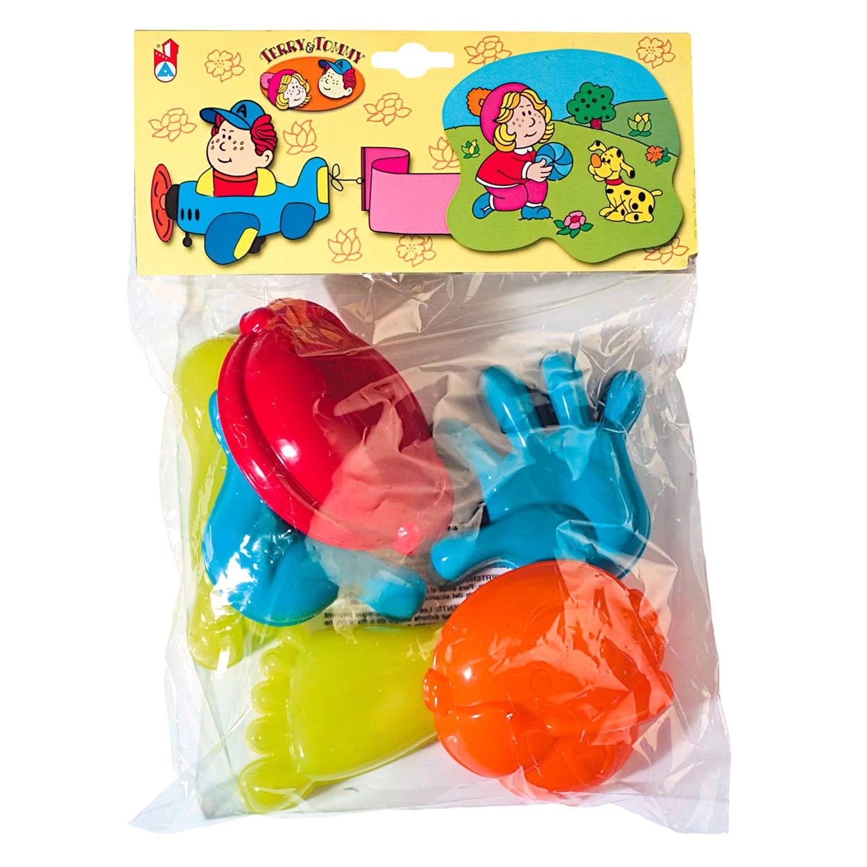 Set zandvormen waarmee je een compleet zandfiguur kunt maken met gezicht, handen en voeten.