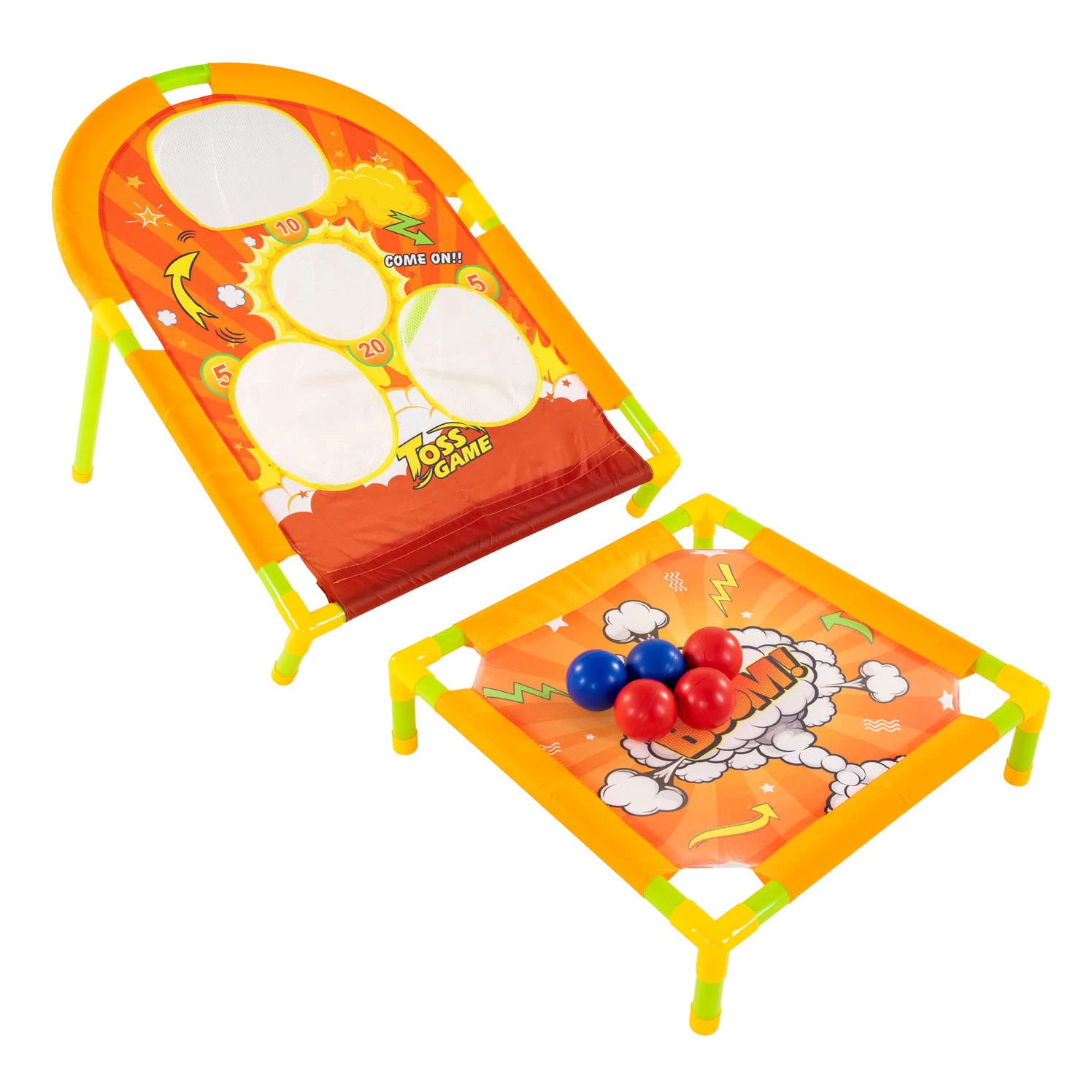 Dit werpspel met balletjes is een leuk, klassiek spel voor alle leeftijden! Gooi de balletjes op de trampoline om ze vervolgens in de zakjes van het kleurrijke scorebord te laten stuiteren om punten te scoren. Speel alleen of in teams! Durf jij de uitdaging aan? De set bevat 4 balletjes, een scorebord en een trampoline. Het werpspel is gemaakt van stevig kunststof. Geschikt vanaf 3 jaar.