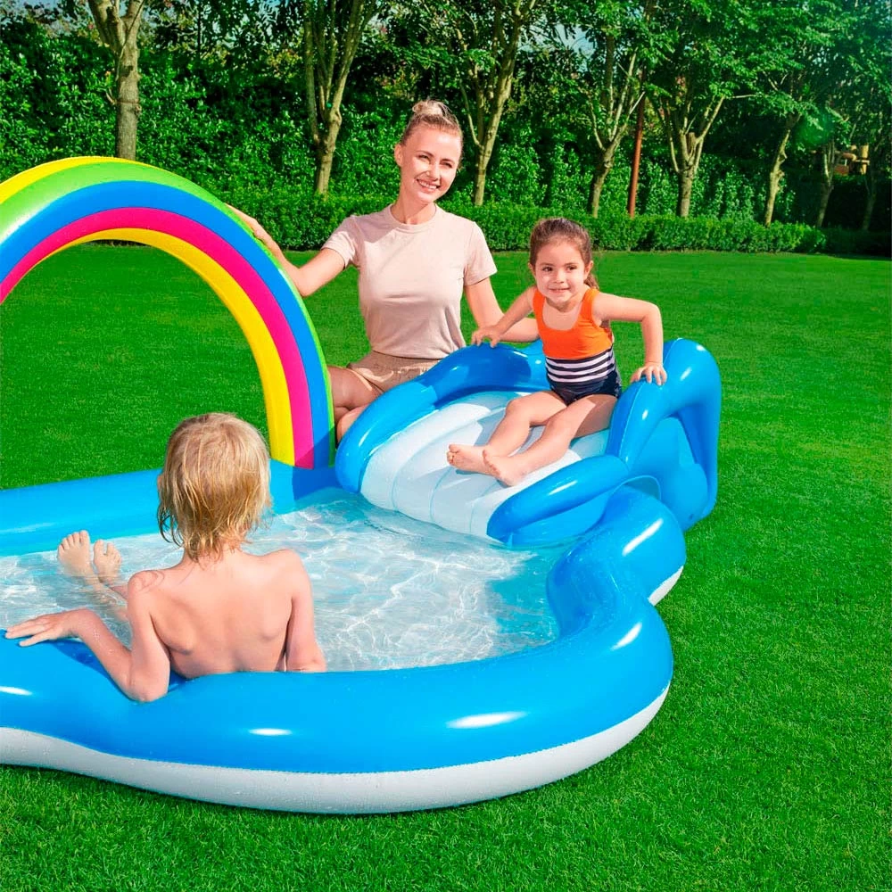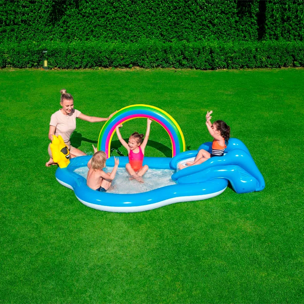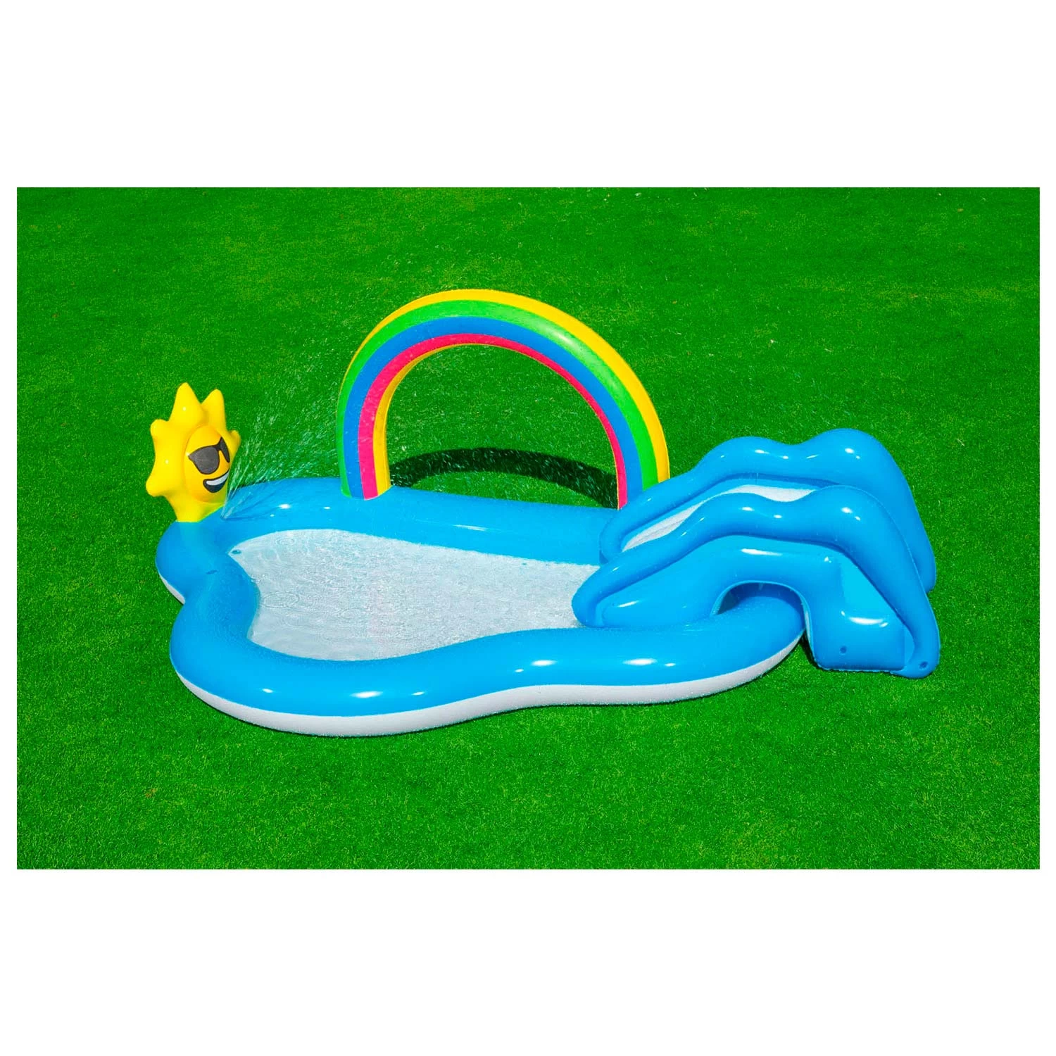 Speelbad voor de kleintjes. Extra groot spetter gedeelte. De ingebouwde watersproeier kan worden aangesloten op een tuinslang. De glijbaan is wegneembaar en de bodemkussens zorgen voor een zachte landing. Voorzien van een regenboog en een vriendelijk zonnetje. Incl. reparatie patch en aftapplug. Watercapaciteit: 170 ltr. leeftijd: 2+. Afmeting: 257x145x91 cm.