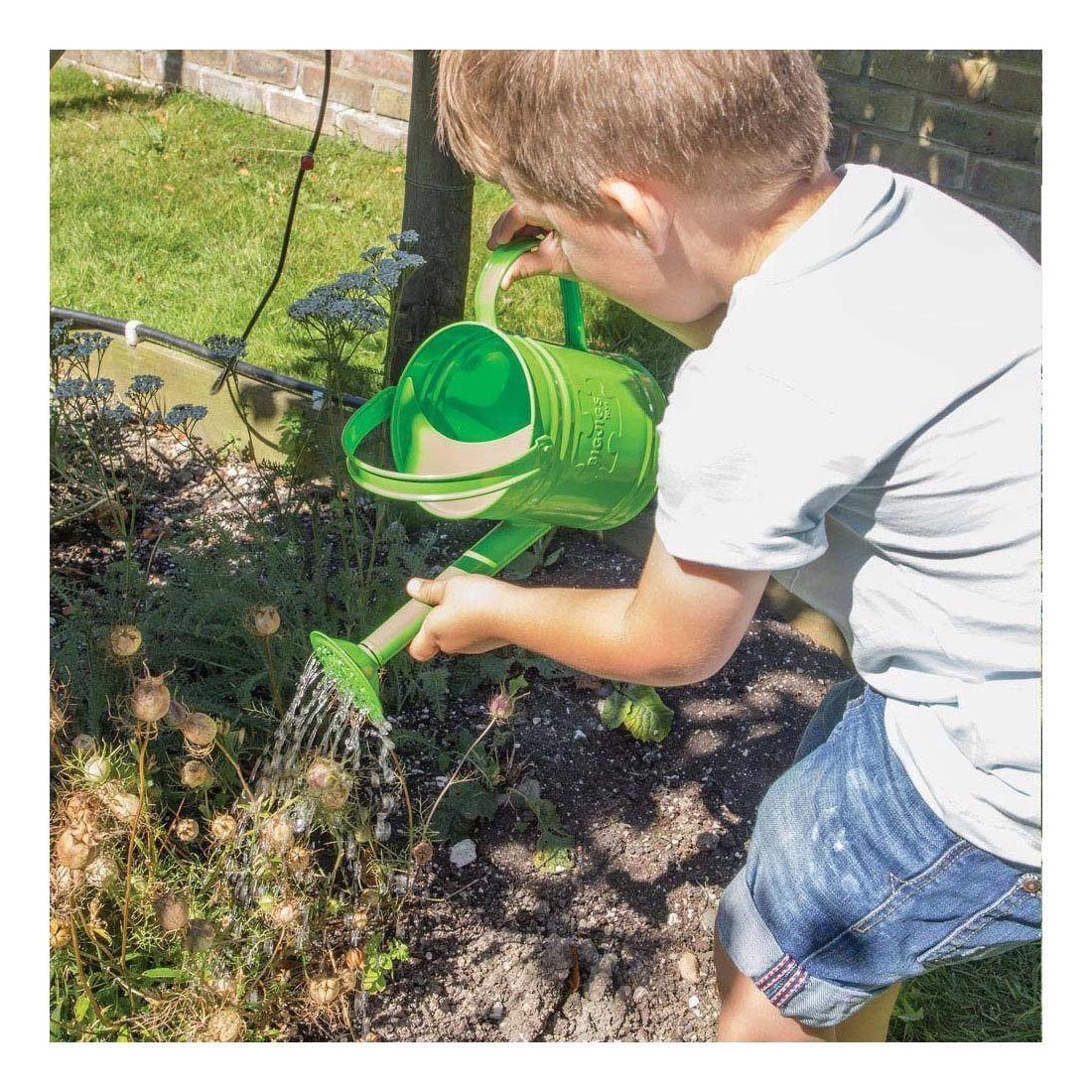 Kleurrijke, leuke en praktische groene gieter voor jonge tuiniers! Met handgreep aan de boven- en zijkant waardoor hij gemakkelijk vast te houden is voor kleine handjes, en een vaste uitloop met gaatjes, zodat het water goed verdeeld wordt.