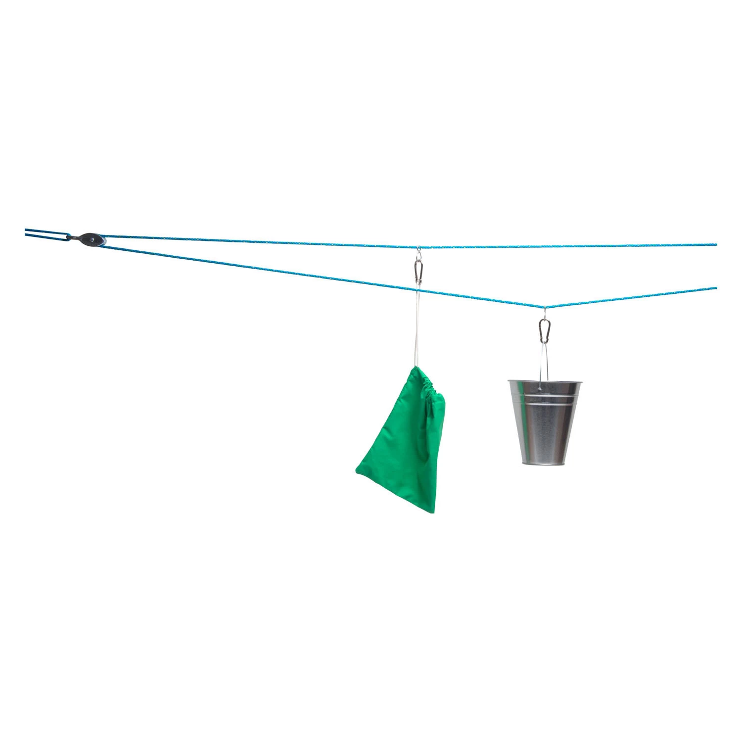 Je eigen kabelbaan, hoe cool is dat? Knoop het touw met de katrollen aan twee kanten vast en trek aan het koord om de emmer en zak in beweging te krijgen. Stuur elkaar briefjes of kleine verrassingen. Het ideale speelgoed om urenlang heerlijk vrij mee te spelen.