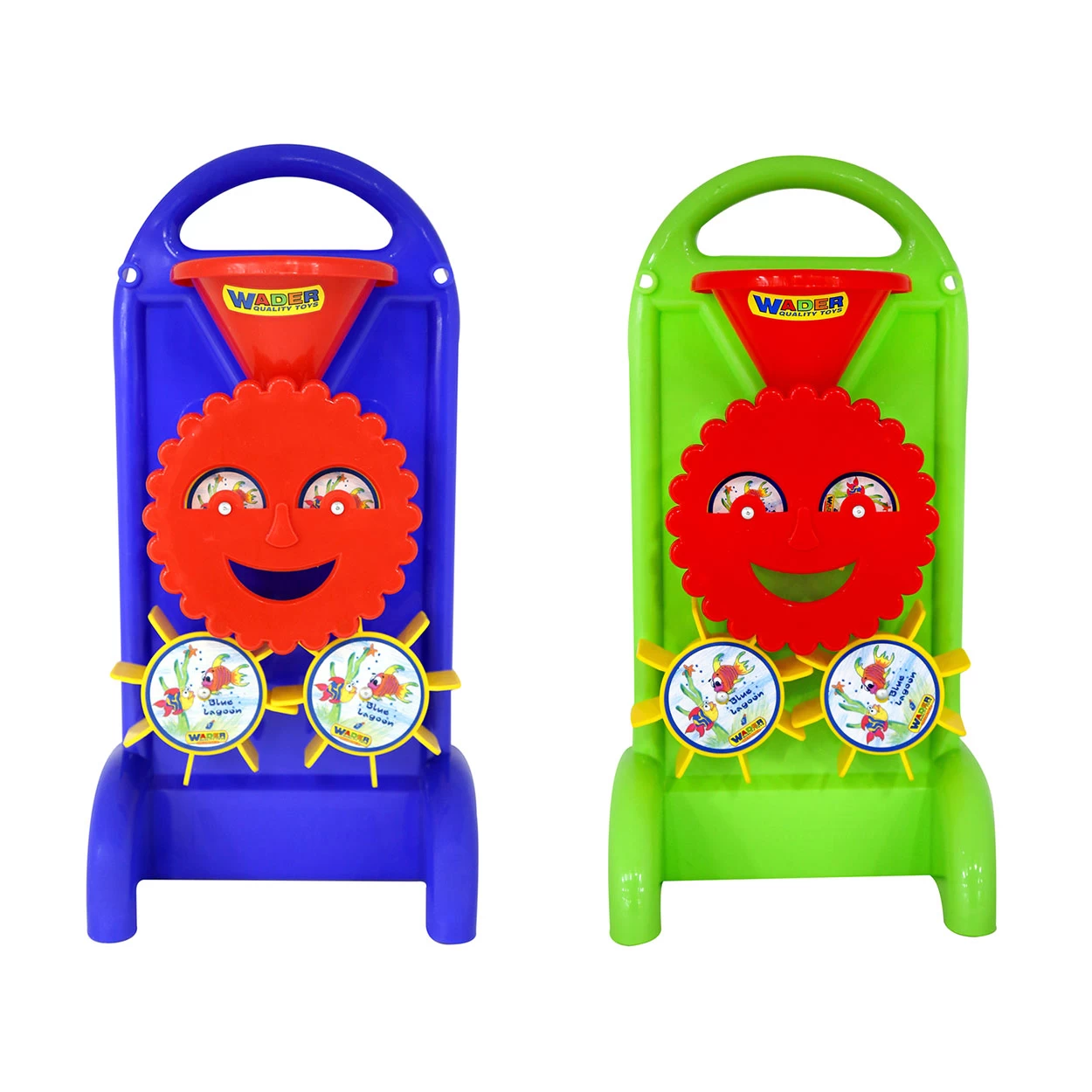 Een gouwe ouwe van vroeger: de Cavallino Zand- en Watermolen. Gooi zand of water bovenin de trechter en kijk hoe de molen in beweging komt. Het is gemaakt van stevige kunststof en is afgewerkt met een lachgezicht aan de voorzijde. Groen en blauw worden willekeurig door elkaar geleverd.