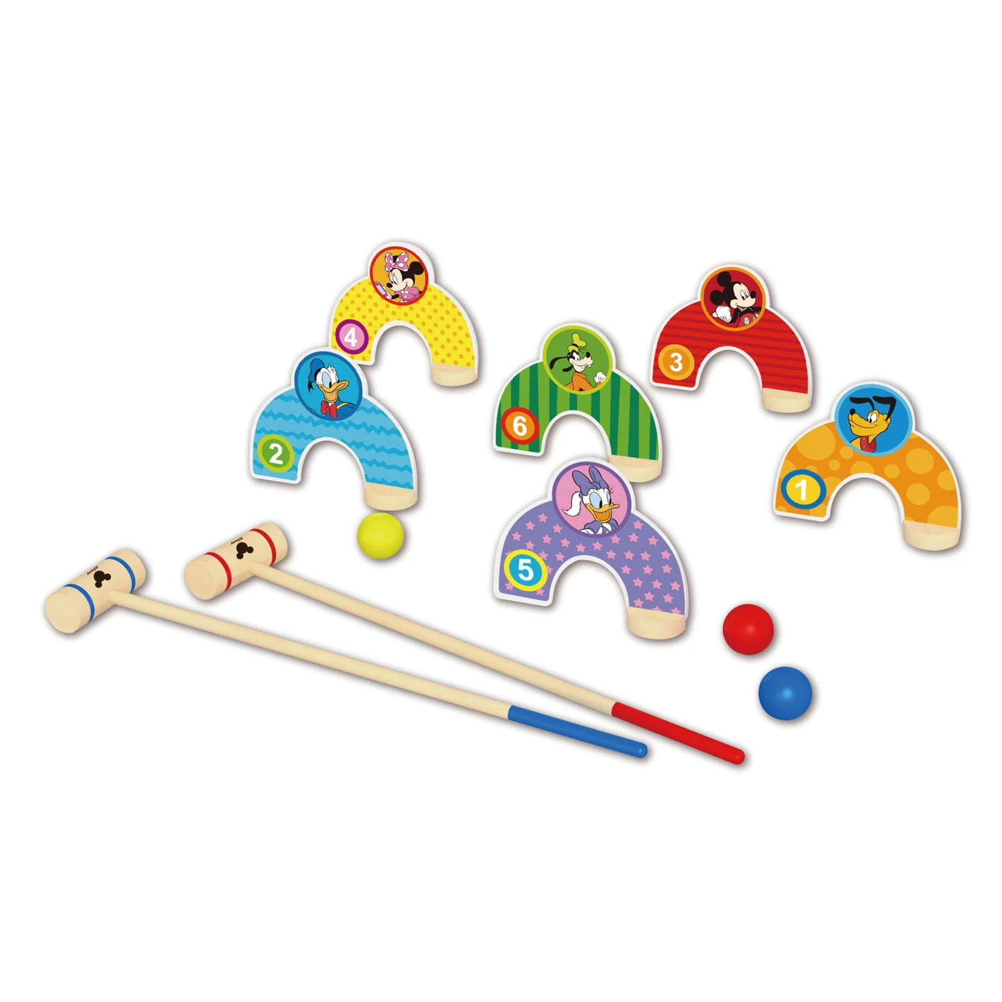 Disney croquetspel Mickey Mouse. Geniet van een middag speelplezier met dit Disney croquetspel! Spelers moeten de houten bal met een hamer door alle ringen slaan. De speler die zijn of haar eigen bal door alle hoepels haalt met het laagst mogelijke aantal slagen, wint het spel. Materiaal: hout. Afmetingen verpakking: 55 x 28 x 5,5 centimeter. Geschikt voor kinderen van 2 tot 6 jaar oud. Inhoud: 2 croquet sticks, 6 bogen en 2 ballen.