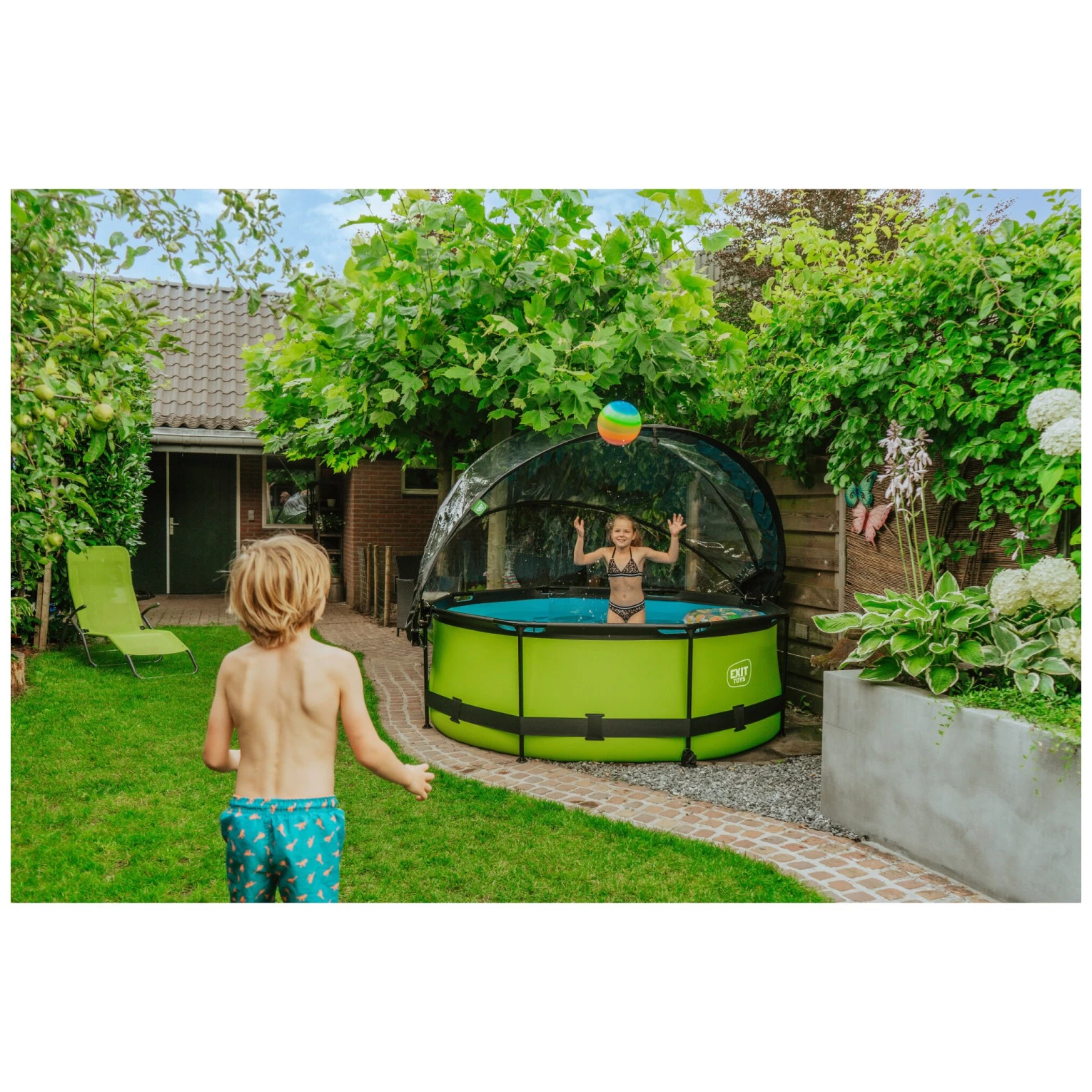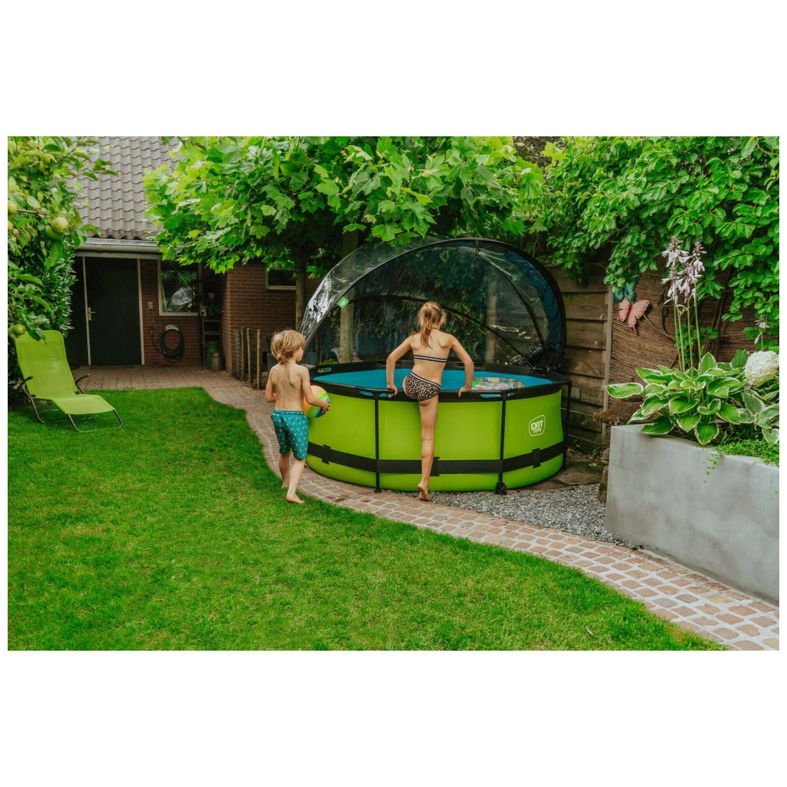 De vrolijke, felle kleur en het zwarte frame geven het Lime zwembad een unieke uitstraling. De binnenzijde van het zwembad is blauw, zodat je het frisse zwembad gevoel houdt.