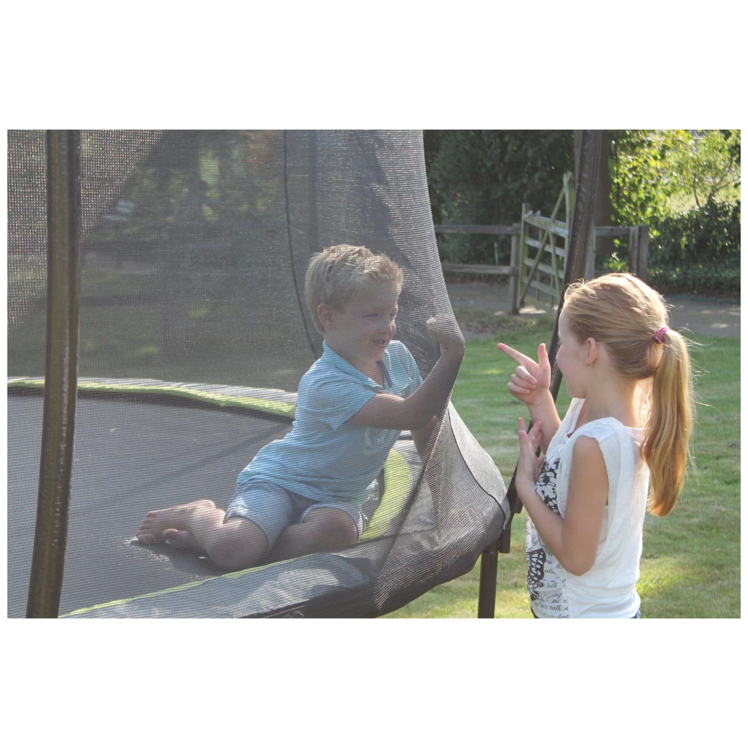 De EXIT Silhouette trampoline op poten is een ronde trampoline van goede kwaliteit. Het veiligheidsnet, dat standaard wordt meegeleverd met de trampoline op poten, is voorzien van gebogen staanders zodat het net strakgespannen staat. De hoogwaardige beschermrand dekt de gegalvaniseerde veren volledig af en is voorzien van een speciaal ontwikkeld voetbeschermingssysteem, zodat je voet niet tussen de veren kunt komen. De stevige veren staan garant voor goede sprongkracht. Het frame van de Silhouette trampoline is gegalvaniseerd en gepoedercoat zodat roest geen kans maakt. Beleef eindeloos veel springplezier op de EXIT Silhouette trampolines!