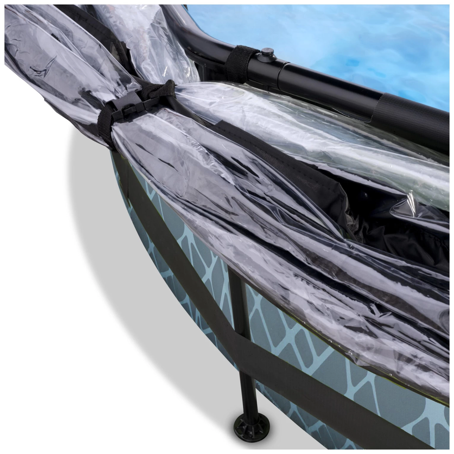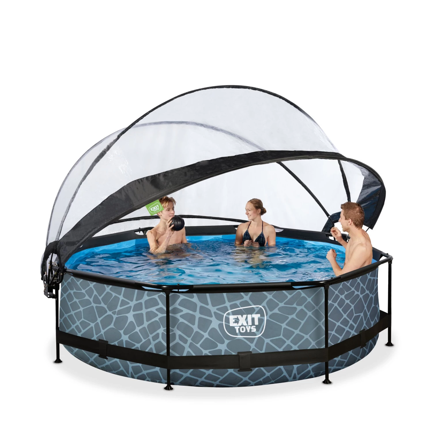 Het stoere steenpatroon en zwarte frame geven het Stone zwembad een unieke uitstraling en dankzij de natuurlijke look integreert het zwembad volledig in je tuin. De ronde vorm van het zwembad creëert een gezellige sfeer en zorgt ervoor dat je eenvoudig met meerdere personen plezier kunt beleven in je zwembad. Met de ronde zwembaden van EXIT Toys verveel je je geen moment.