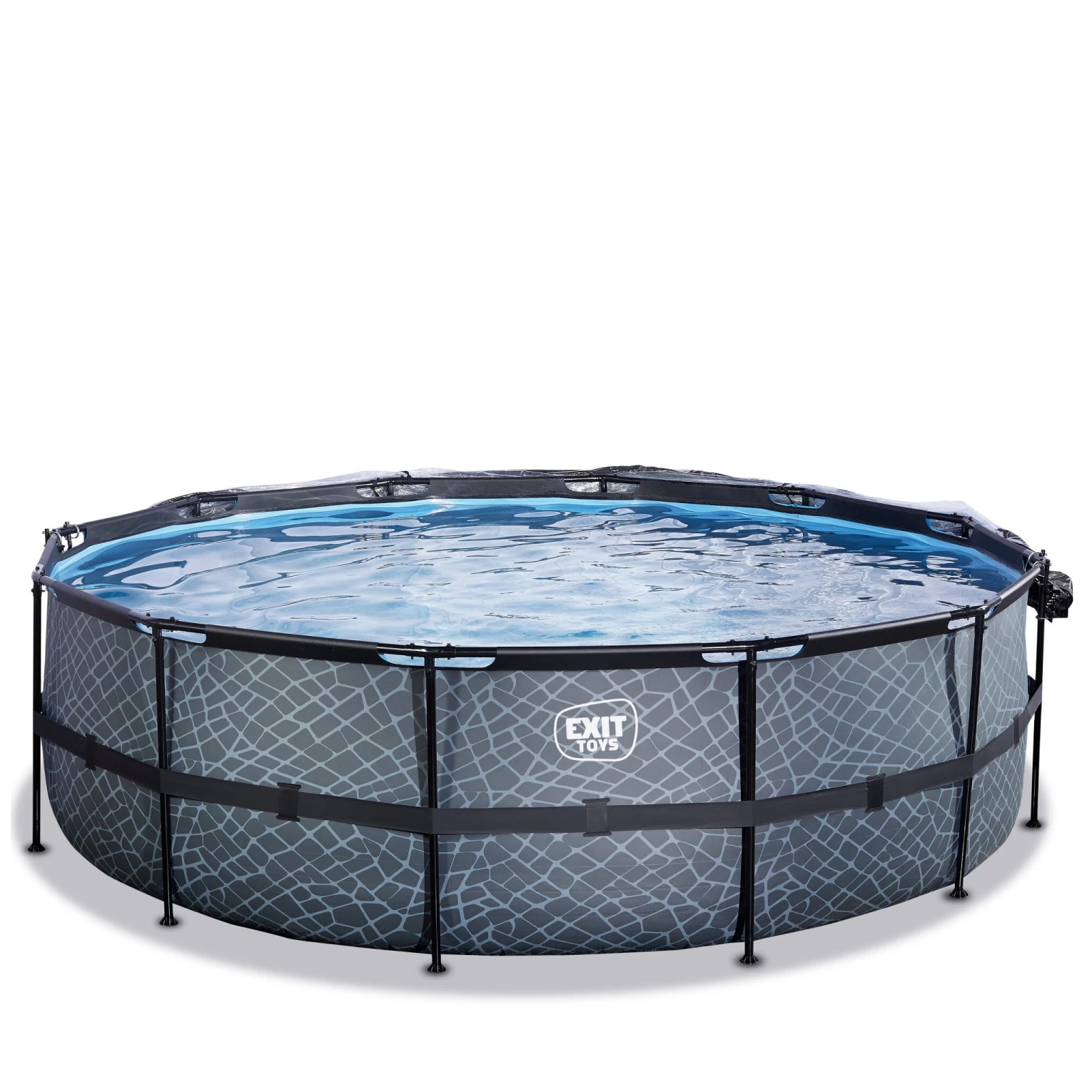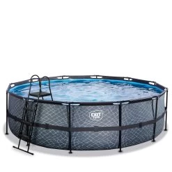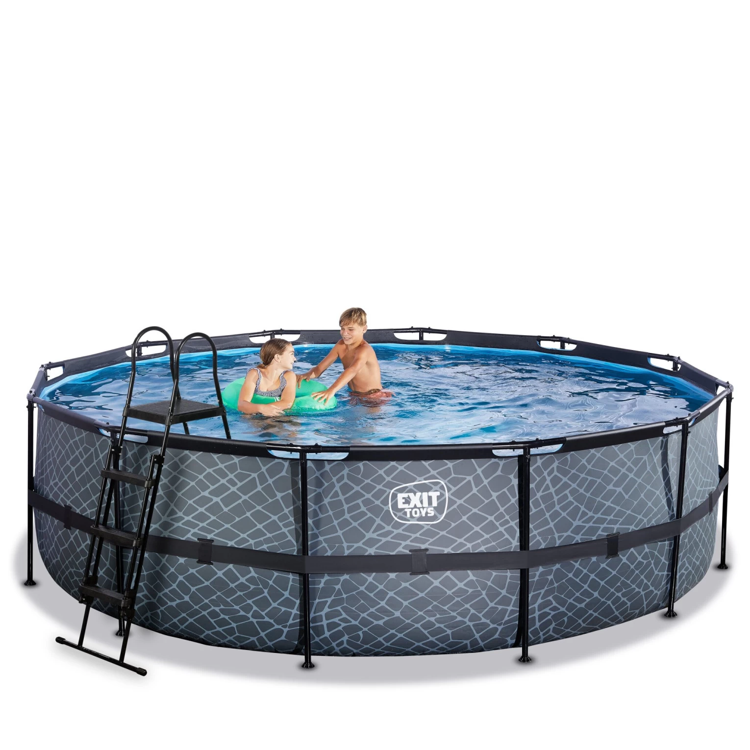 Het EXIT Stone zwembad ø488 x 122 cm is een rond, grijskleurig frame zwembad. Het zwembad is standaard voorzien van een filterpomp en een zwembadtrap, waarmee je veilig het zwembad in en uit kunt stappen. Het Stone zwembad heeft een modern en stoer steenpatroon op de zijkant en is daarmee een échte blikvanger in de tuin. De binnenzijde van het zwembad is blauw, voor het frisse zwembadgevoel. Het EXIT zwembad is uitgevoerd met sterke 3-laags wanden van pvc en polyester.