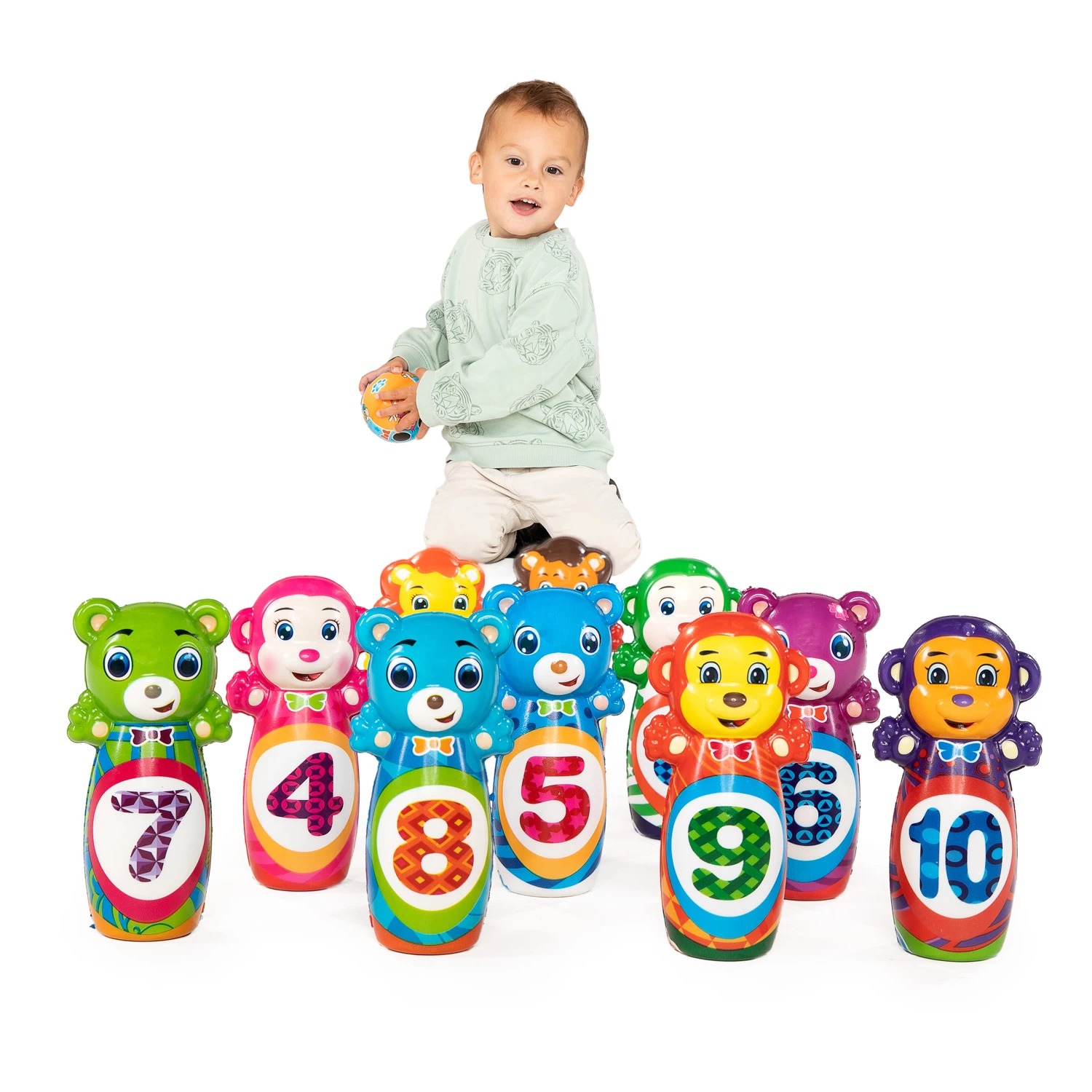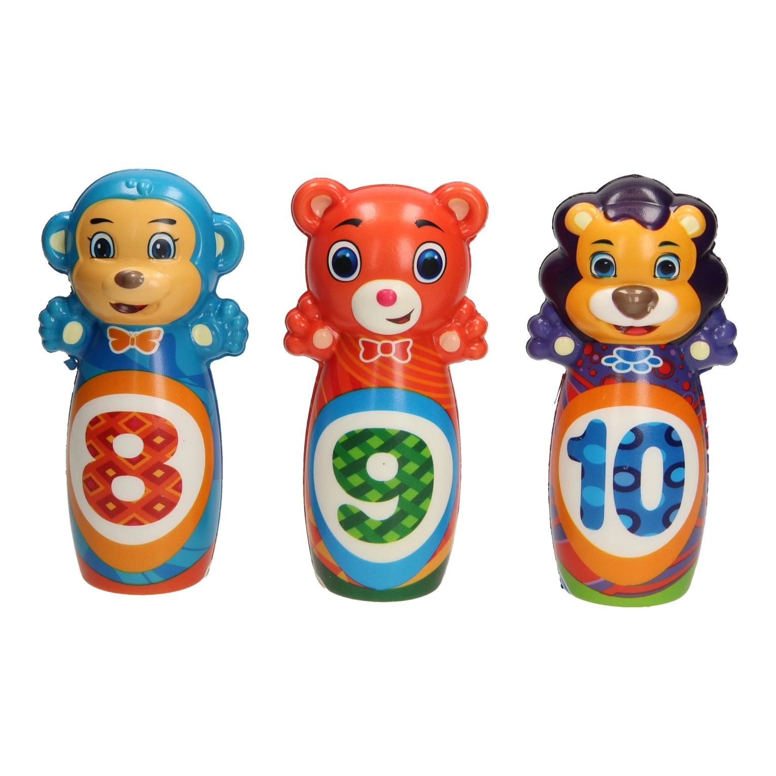 Wie gooit de meeste kegels om? Spannend! De kleurrijke kegels en bowlingballen zijn gemaakt van foam. Hierdoor is het spel geschikt voor binnen en buiten! De set bevat 10 kegels en 2 bowlingballen. De kegels hebben de vorm van een aap, een leeuw of een beer. Bowlen stimuleert de motoriek en de hand-oogcoördinatie. Geschikt voor kinderen vanaf 3 jaar.
