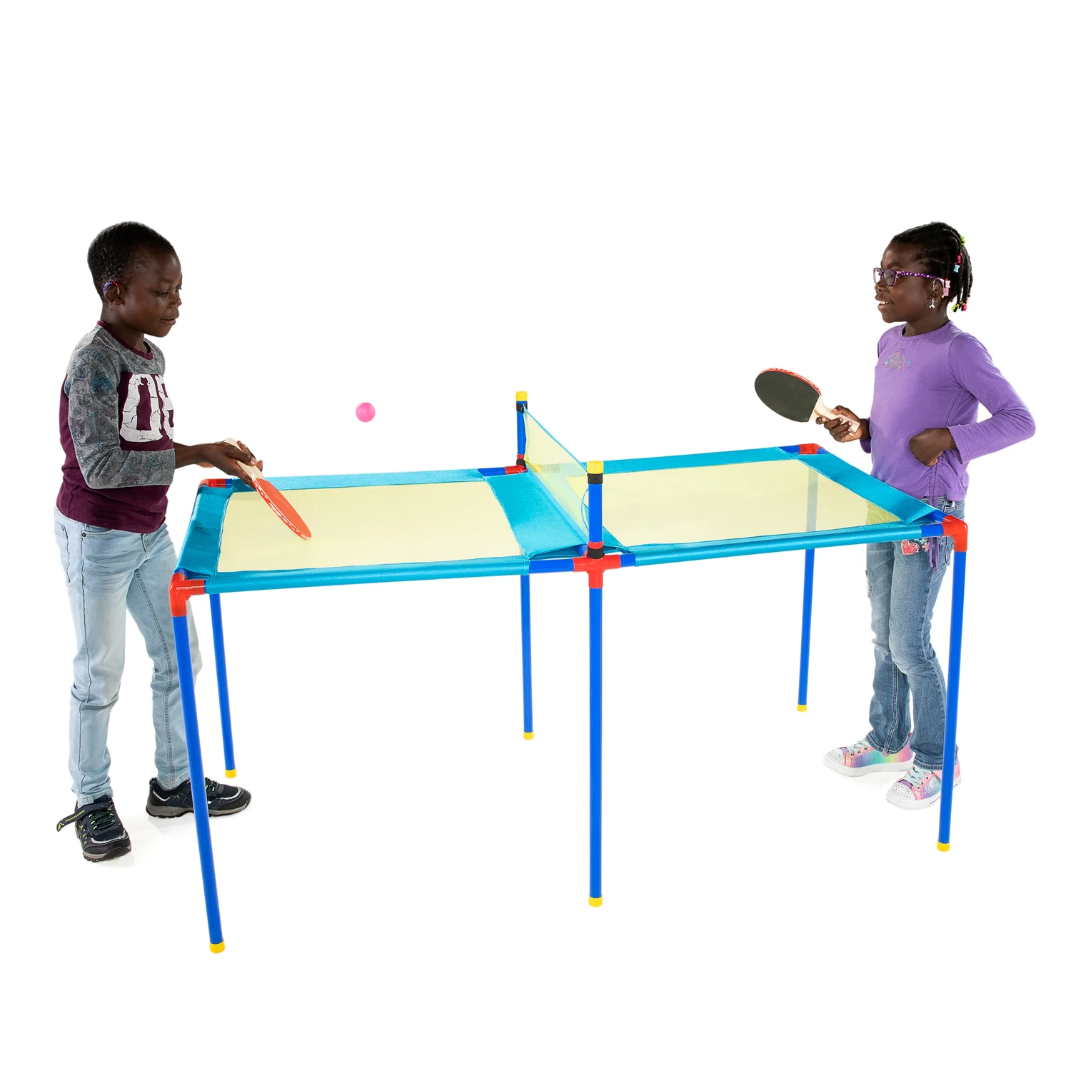 Tafeltennis is dé sport voor op vakantie als je naar de camping gaat. Met deze tafeltennistafel kun je je nu het hele jaar lang voorbereiden om de beste pingponger van de club te worden! De pingpongtafel is in kinderformaat gemaakt. De buizen zijn makkelijk in elkaar te klikken om de tafel op te zetten. Het ’tafelblad’ is een kunststof doek dat strak aangespannen wordt. Bij deze pingpongset worden ook tafeltennisbadjes en een pingpongbal geleverd.