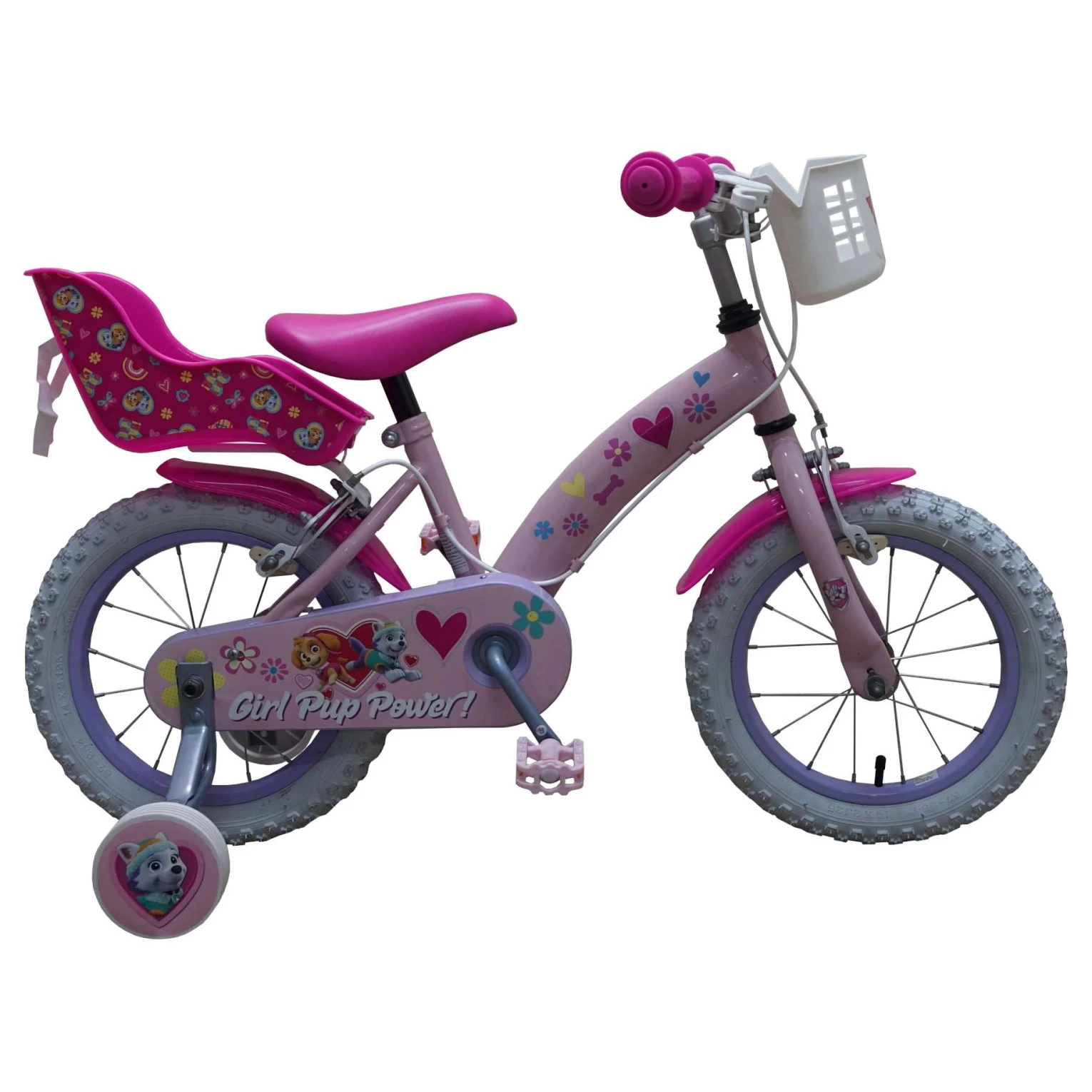 PAW Patrol 14 inch kinderfiets. PAW Patrol is de super leuke en spannende televisie serie, speciaal voor de jongste kinderen. De 14 inch kinderfiets is helemaal in de stijl van deze special. Met deze fiets met afneembare zijwieltjes kan ieder kind snel van begin tot praktijk te leren fietsen. Doordat stuur- en zadelhoogte aanpasbaar zijn, kan de fiets met uw kindje meegroeien en biedt deze ook uitdaging op het gebied van balans en motoriek. In het fietsmandje kunnen alle spulletjes worden meegenomen. Verder heeft de fiets luchtbanden met stalen spaken, een gesloten kettingkast ter bescherming van de kleine vingertjes en een poppenzitje. Om vaart te kunnen minderen heeft de fiets twee handremmen (GEEN TERUGTRAPREM). Deze fiets is speciaal voor kinderen tussen de 3,5 en 5 jaar oud met kledingmaat 98-110. Met deze fiets kan ieder kindje zo goed fietsen, waardoor het voelt alsof ze dezelfde krachten hebben als de PAW Patrol Pups! Wieeee, daar ga je!
