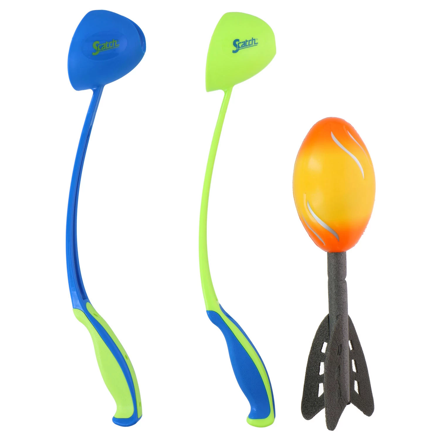 Met dit raketbal lanceerspel is het heerlijk buiten spelen. In de verpakking zitten twee werpers en één raketbal. Klem de raketbal in één van de werpers en maak een zwaaiende beweging naar voren zodat de raketbal uit de werper vliegt. Wie de raketbal het verst schiet, heeft gewonnen! Dankzij de vleugels aan de raketbal kan hij nog verder vliegen. Speel het spel alleen of samen.