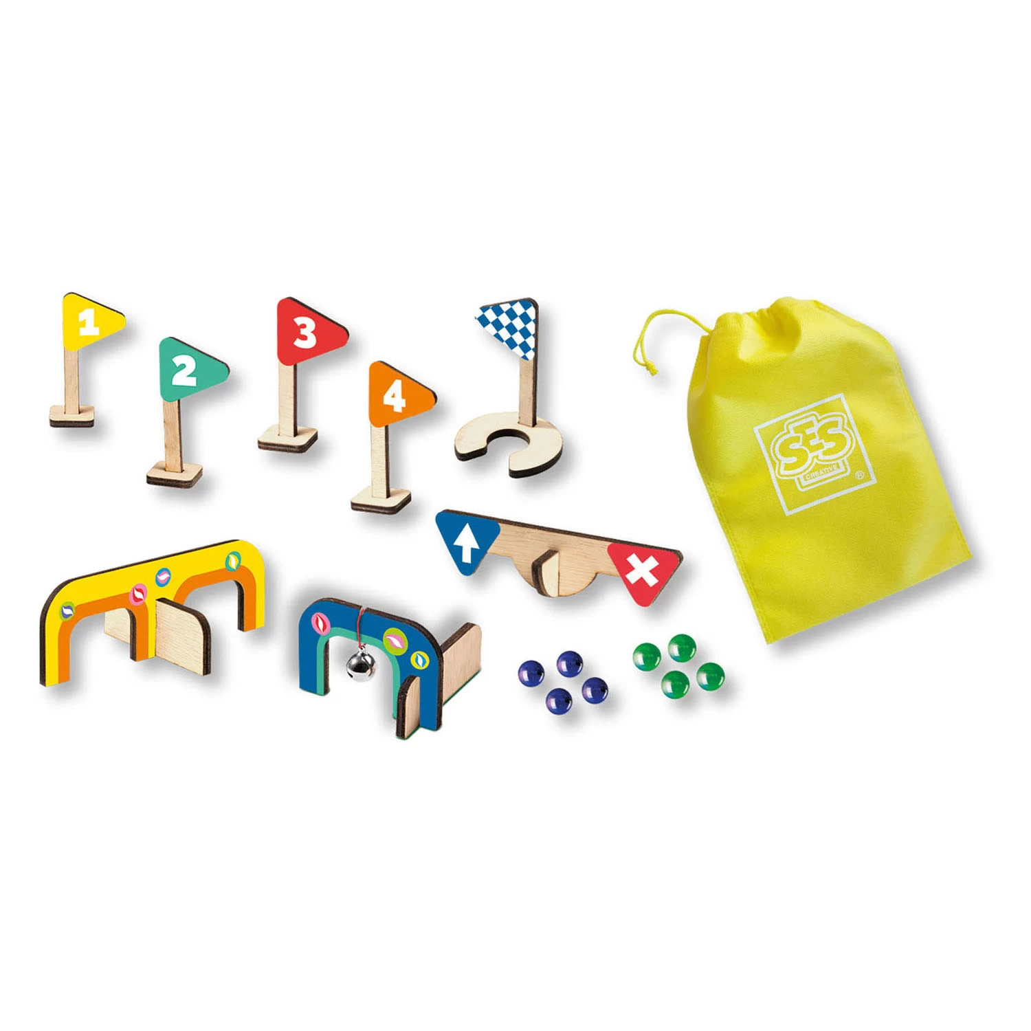 Met dit uitgebreide minigolf parcours mét knikkers is er eindeloos plezier te beleven! De set komt met houten obstakels en acht knikkers. Zet de obstakels neer zoals jij wilt en begin met de uitdaging! Wie gaat er winnen? De houten obstakels zijn niet alleen leuk, maar hebben ook elementen zoals een bel en een draaideur. Ben je klaar met het spel? Dan kan het heel makkelijk overal mee naar toe door de handige bewaartas!