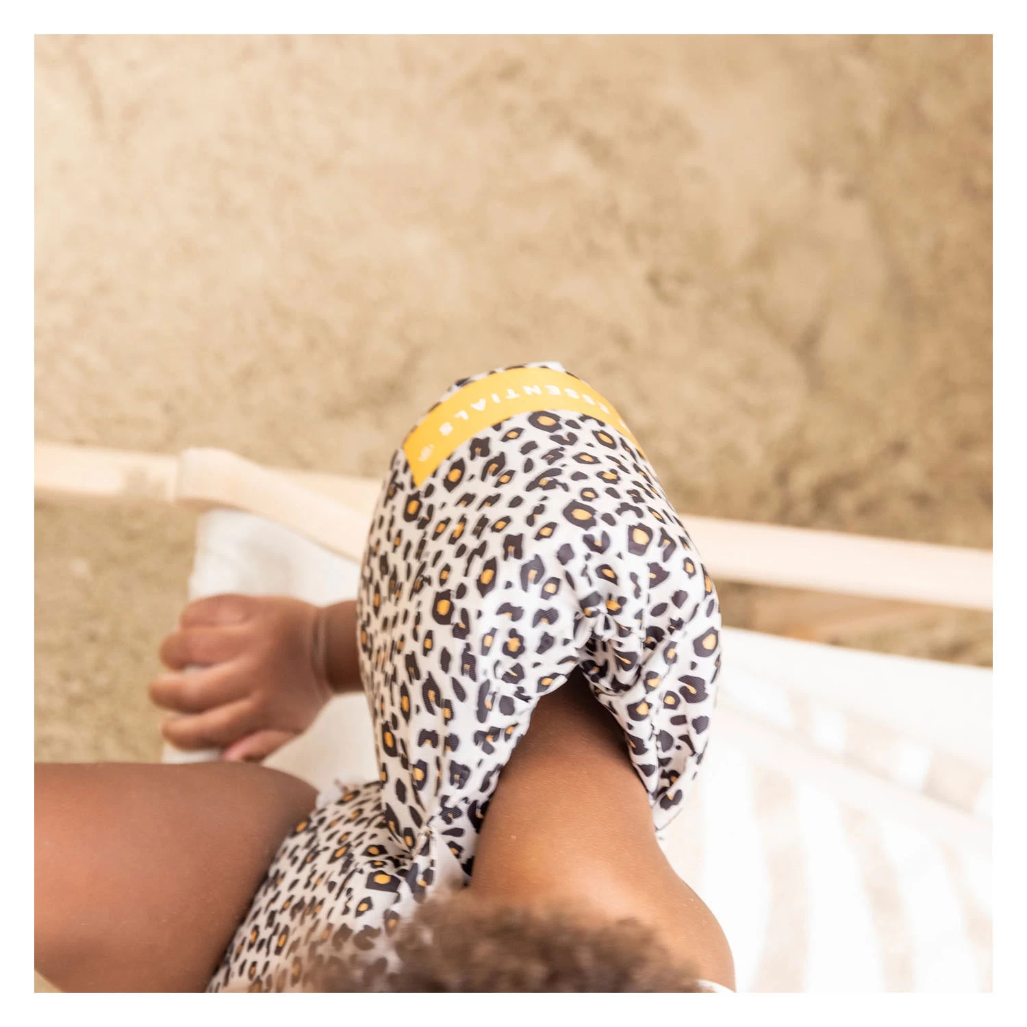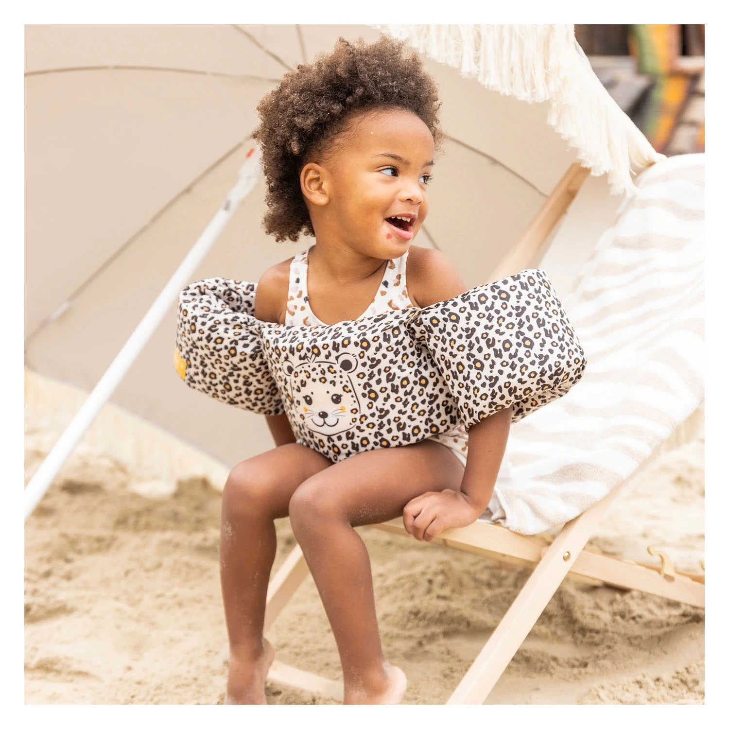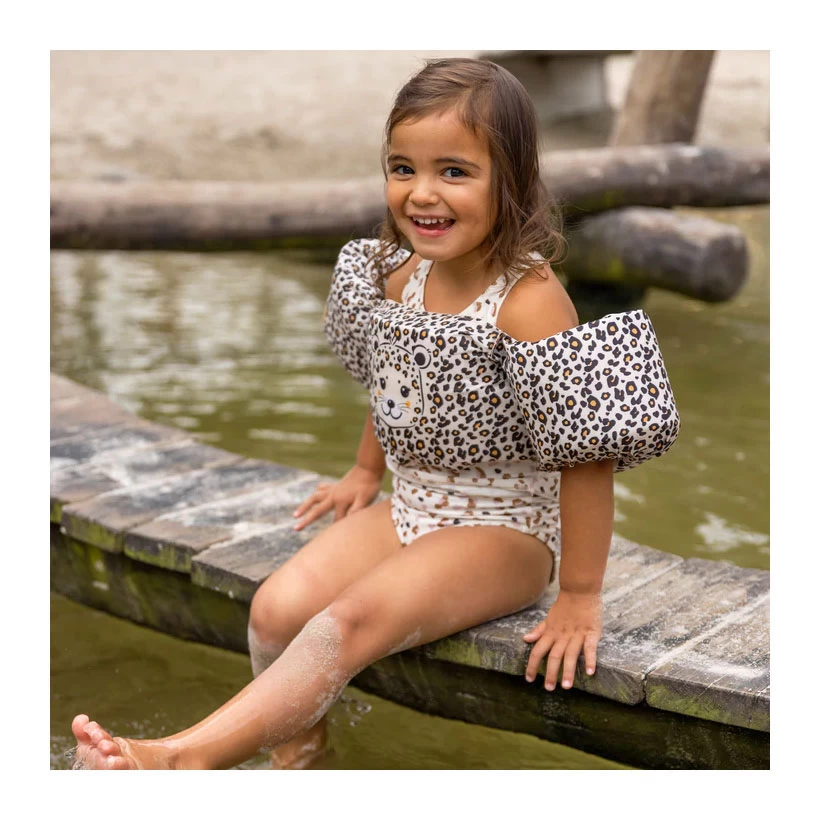 Deze puddle jumper zwemvest met unieke beige panterprint is geschikt voor meisjes tussen de 2 en 6 jaar oud met een gewicht tussen de 15 en 30 kg. Materiaal: schuim.