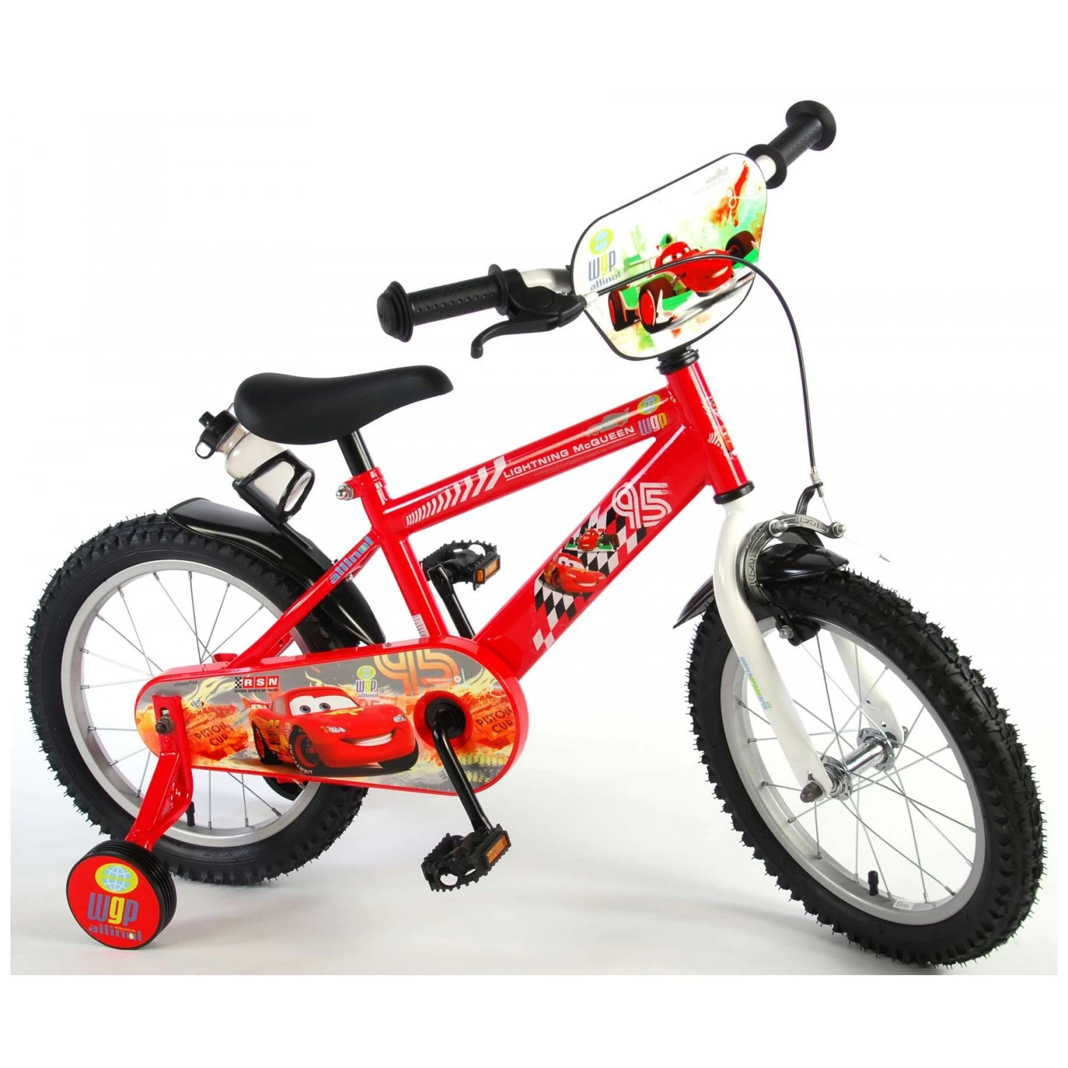 Disney Cars 16 inch jongensfiets. De film van Disney Pixar kent elke jongen. Deze Cars kinderfiets is werkelijk een topper, net als de film. Super mooi, stoer en modern frame. Elke jongen maakt met deze stoere fiets de Blitz. Deze fiets heeft een bidonhouder. Vroeeeemmm daar ga je net zo snel als Bliksem McQueen. Met stevige zijwielen om snel te leren fietsen. Official Licensed Disney Product.