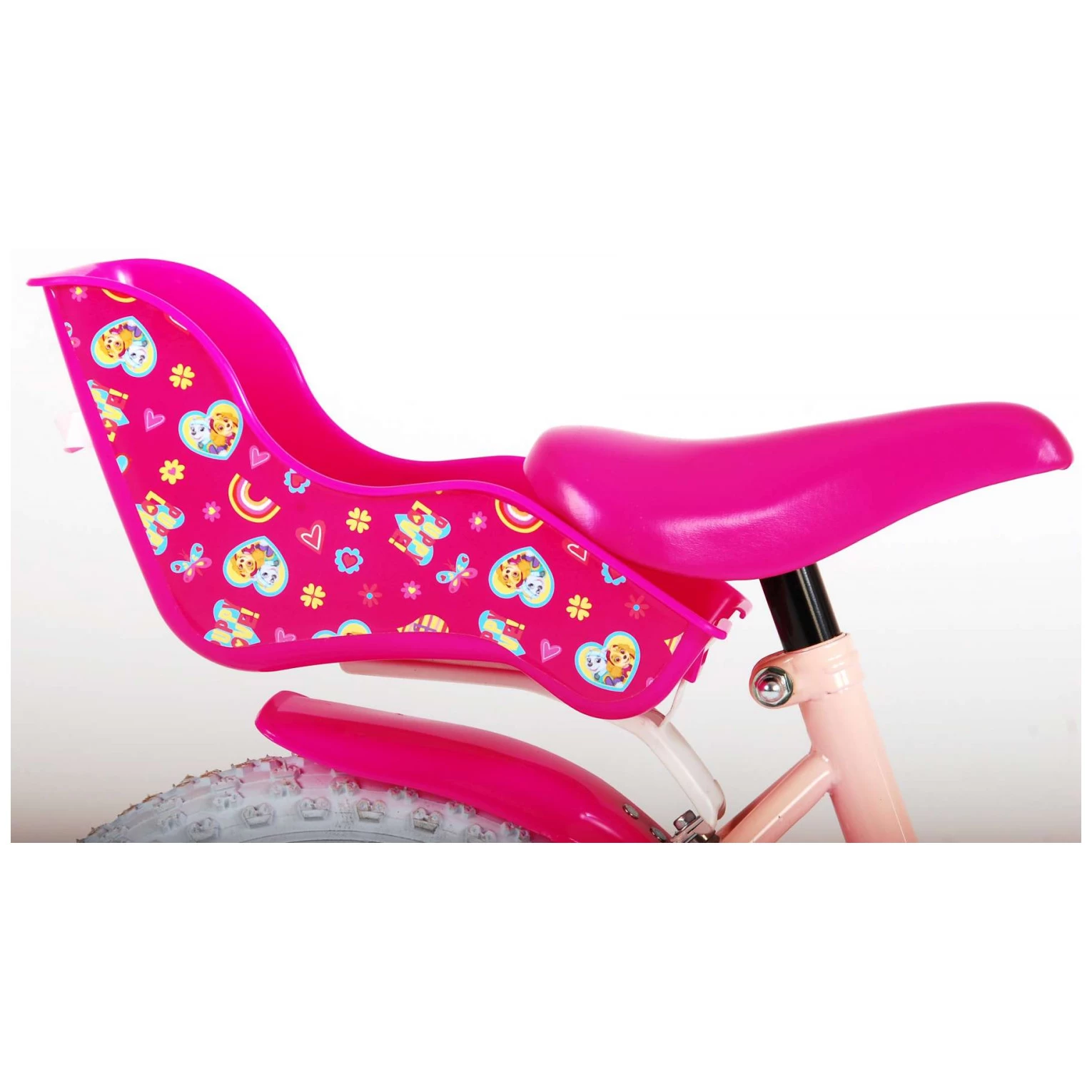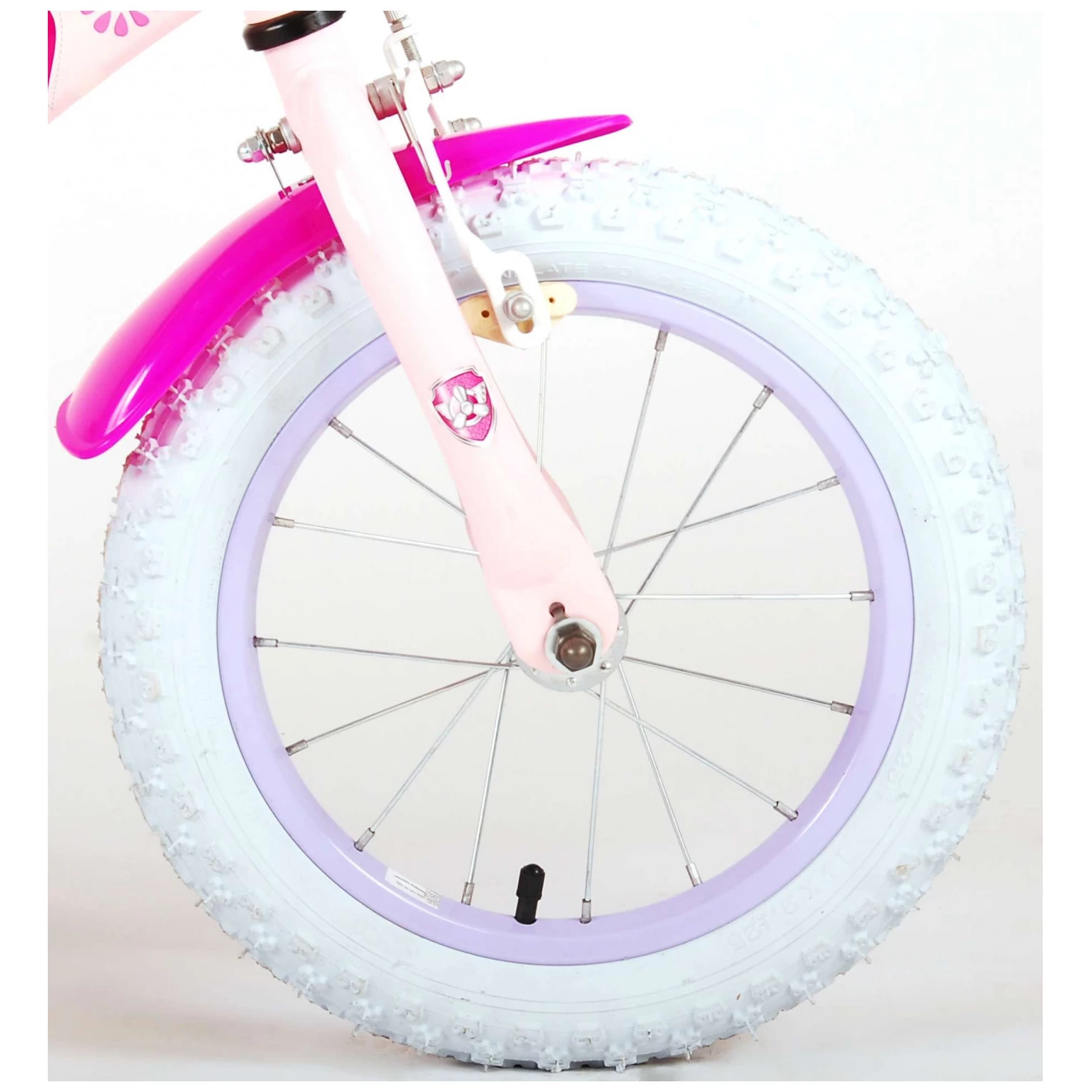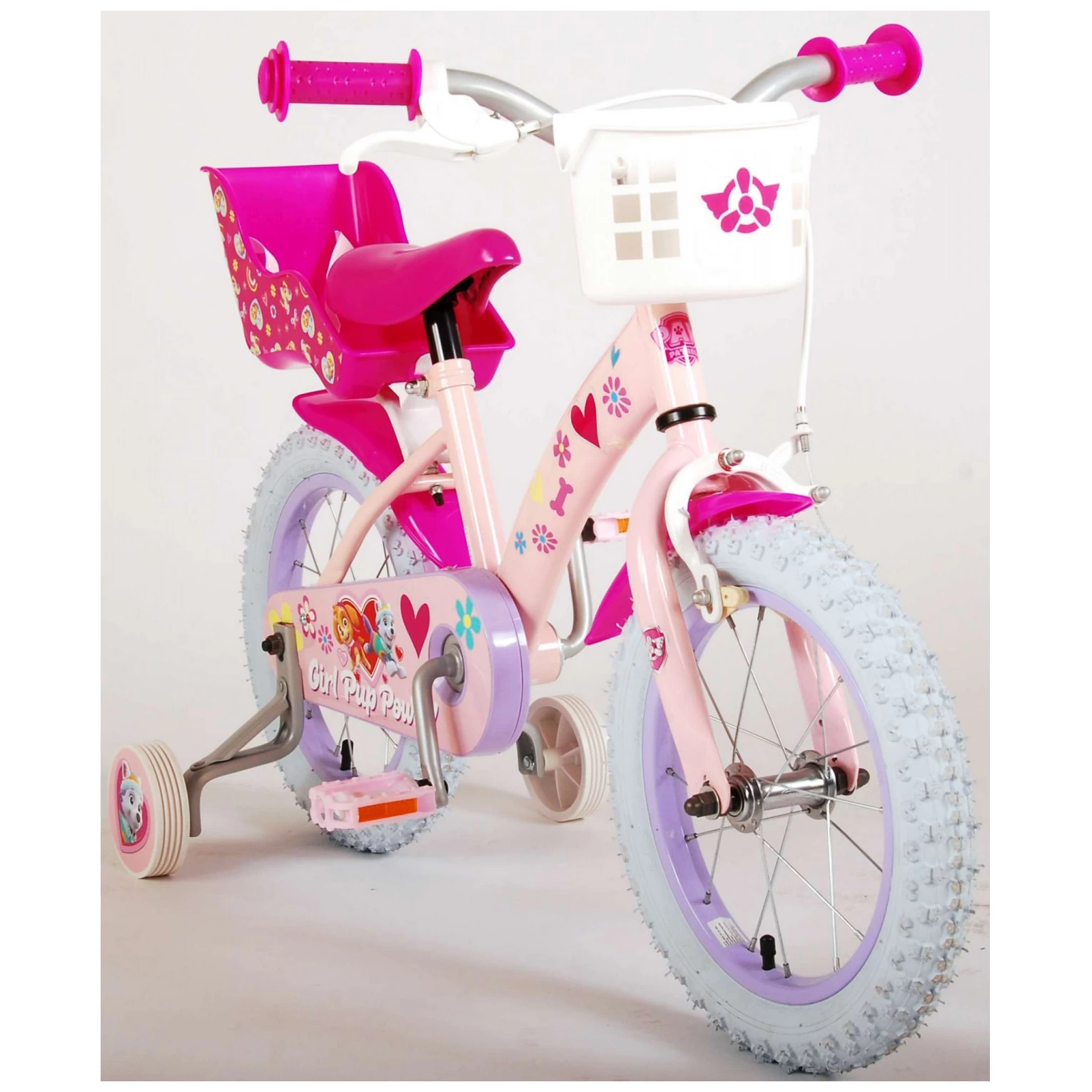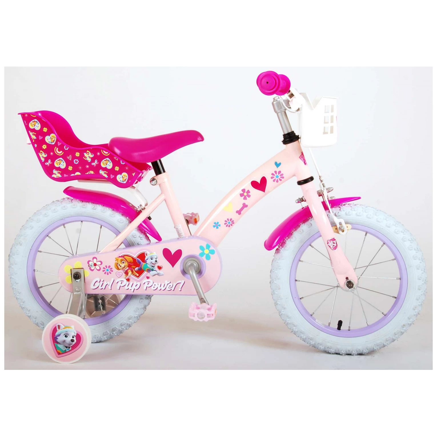 PAW Patrol 14 inch kinderfiets. PAW Patrol is de super leuke en spannende televisie serie, speciaal voor de jongste kinderen. De 12 inch kinderfiets is helemaal in de stijl van deze special. Met deze fiets met afneembare zijwieltjes kan ieder kind snel van begin tot praktijk te leren fietsen. Doordat stuur- en zadelhoogte aanpasbaar zijn, kan de fiets met uw kindje meegroeien en biedt deze ook uitdaging op het gebied van balans en motoriek. In het fietsmandje kunnen alle spulletjes worden meegenomen. Verder heeft de fiets luchtbanden met stalen spaken, een gesloten kettingkast ter bescherming van de kleine vingertjes, zowel een handrem als een terugtraprem en een poppenzitje. Deze fiets is speciaal voor kinderen tussen de 3,5 en 5 jaar oud met kledingmaat 98-110. Met deze fiets kan ieder kindje zo goed fietsen, waardoor het voelt alsof ze dezelfde krachten hebben als de PAW Patrol Pups! Wieeee, daar ga je!