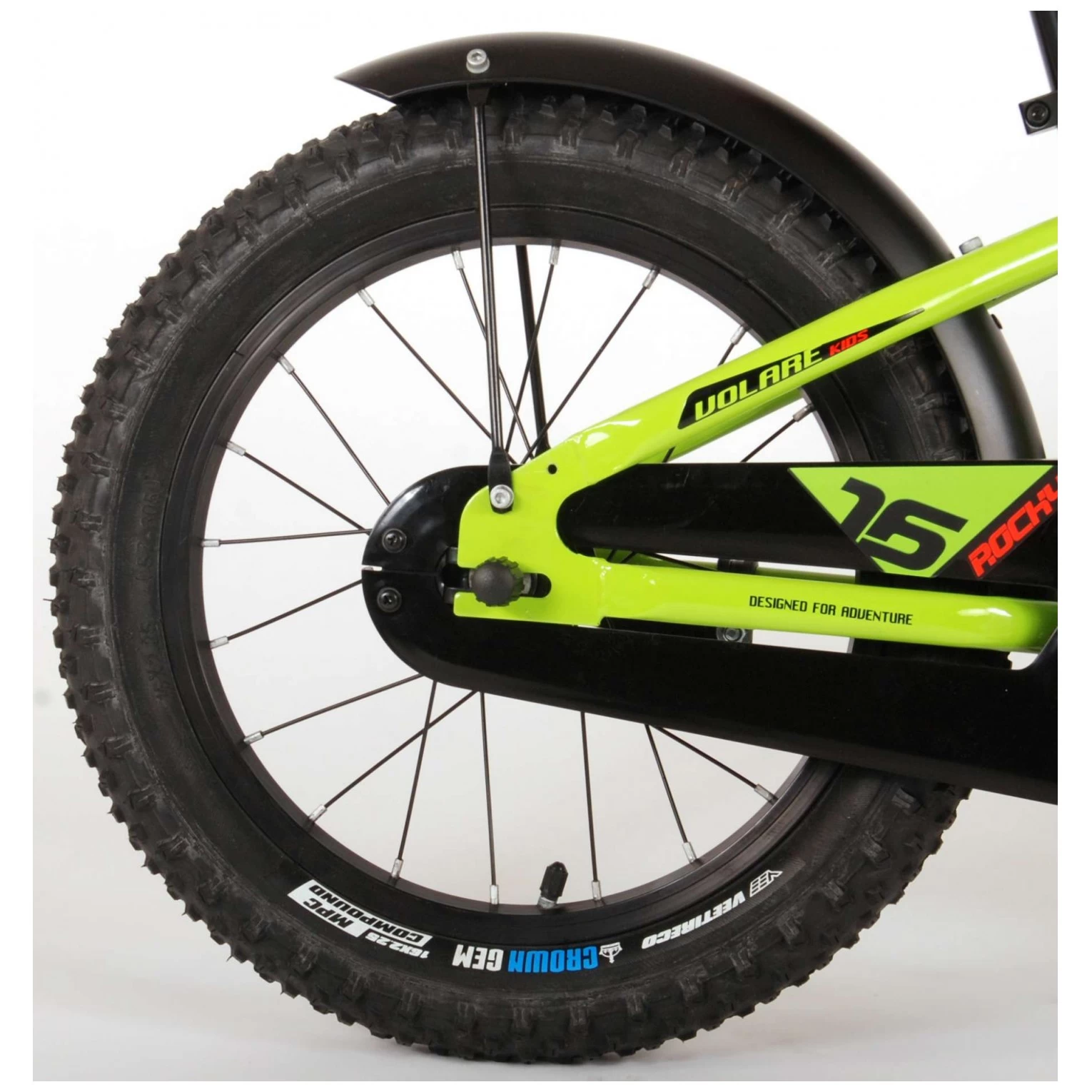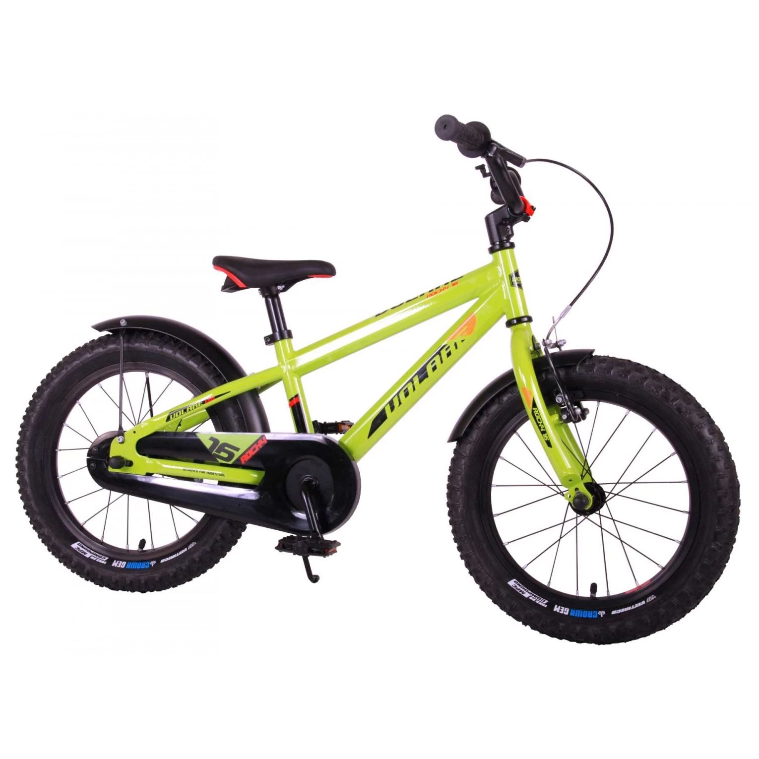 Volare Rocky 16 inch kinderfiets 95% afgemonteerd. De Volare Rocky kinderfietsrange is van superieure kwaliteit. De 16 inch Rocky is een stoere jongensfiets met extra brede banden, waar ieder kinderhart sneller van gaat kloppen. Ook de spatborden zijn extra groot en mooi gevormd waardoor zij al het opspattende vuil tegenhouden. Om vaart te kunnen minderen heeft de fiets een veilig remsysteem met een stevige aluminium V-brake. Daarnaast heeft de fiets een aluminium smart conrtol systeem, dat ervoor zorgt dat het stuur begrensd is. De fiets heeft een gesloten kettingkast, stevig standaard en een fietsbel. Het geometrische frame in de groene kleur maakt van deze fiets een echte eyecatcher. Deze fiets is dé fiets om kinderen te inspireren om de wereld te gaan ontdekken. Bovendien is de fiets voor 95% afgemonteerd, dus bijna fietsklaar. Wel zo gemakkelijk!