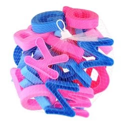 Kunststof zandvormen in de vorm van alle letters van het alfabet. De zandvormpjes zijn in de kleuren lichtroze, roze, lichtblauw en blauw. De letters zijn 7 cm bij 6 cm.