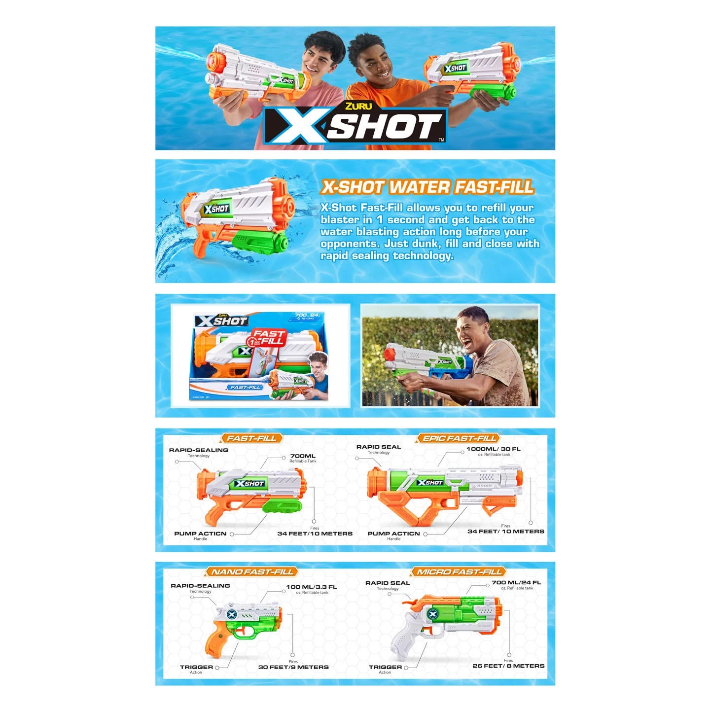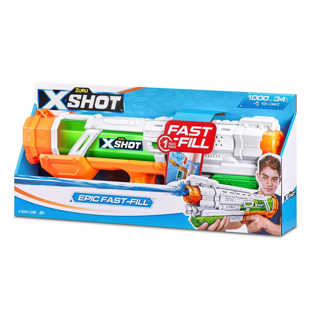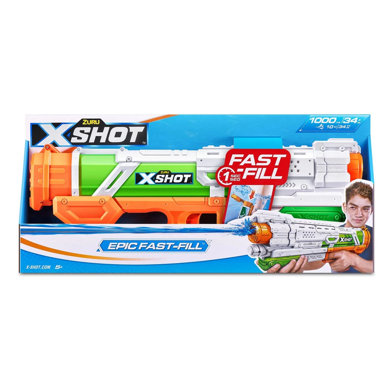 Own de zomer met het nieuwe X-Shot Water Fast Fill Skins-assortiment! X-Shot Fast-Fill Hyperload stelt je in staat om je blaster in slechts 1 seconde bij te vullen en terug te keren naar de waterblaster-actie lang voordat je tegenstanders. Simpelweg onderdompelen, vullen en sluiten met snelle afdichtingstechnologie. Dit waterpistool schiet tot 10 meter met zijn 1000 ml watertank!